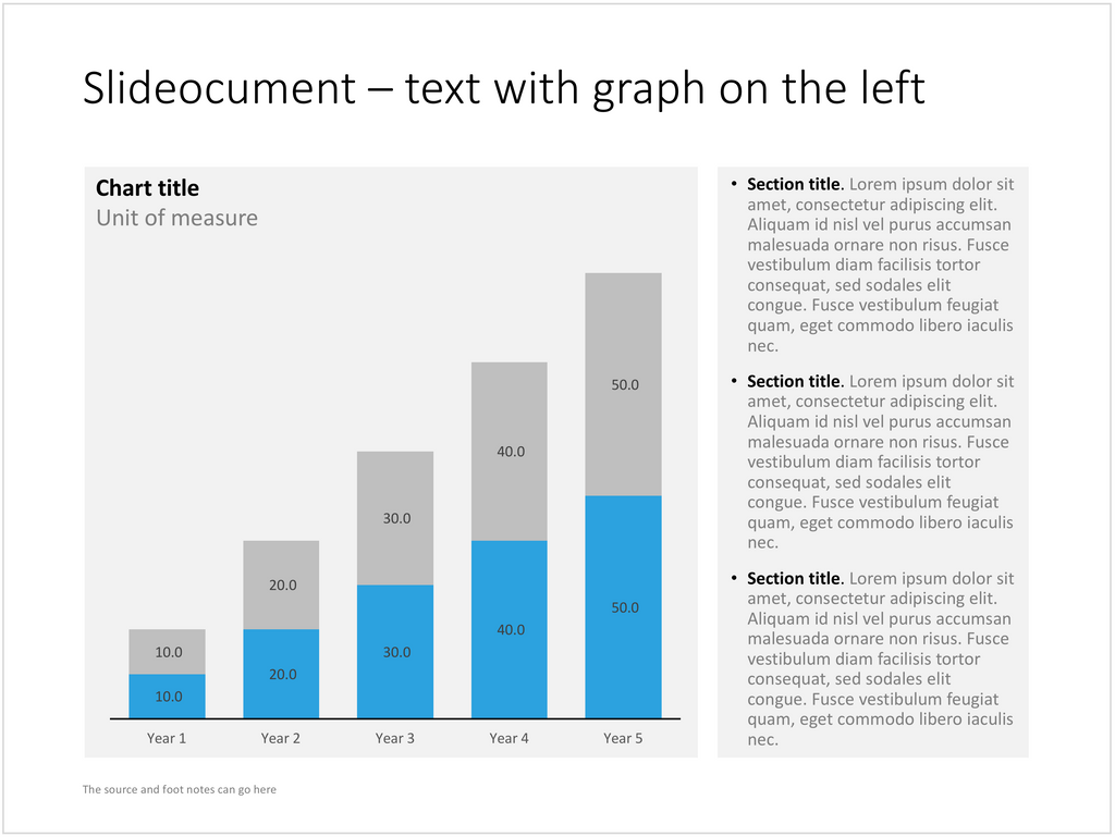 A chart with very dense text in documents that are meant for reading rather than presenting in front of a live audience. Next to the text column is space for a data chart.